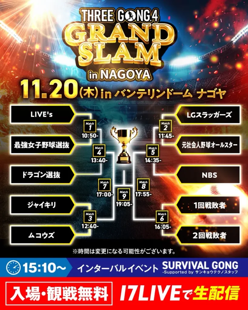 さらに、過去大会で激戦を繰り広げたYouTuberチーム“ジャイキリ”、全国の強豪チームで活躍した社会人経験者が集う“元社会人野球オールスター”、そして17LIVEの人気ライバーが率いる“LIVE’s”が参戦。